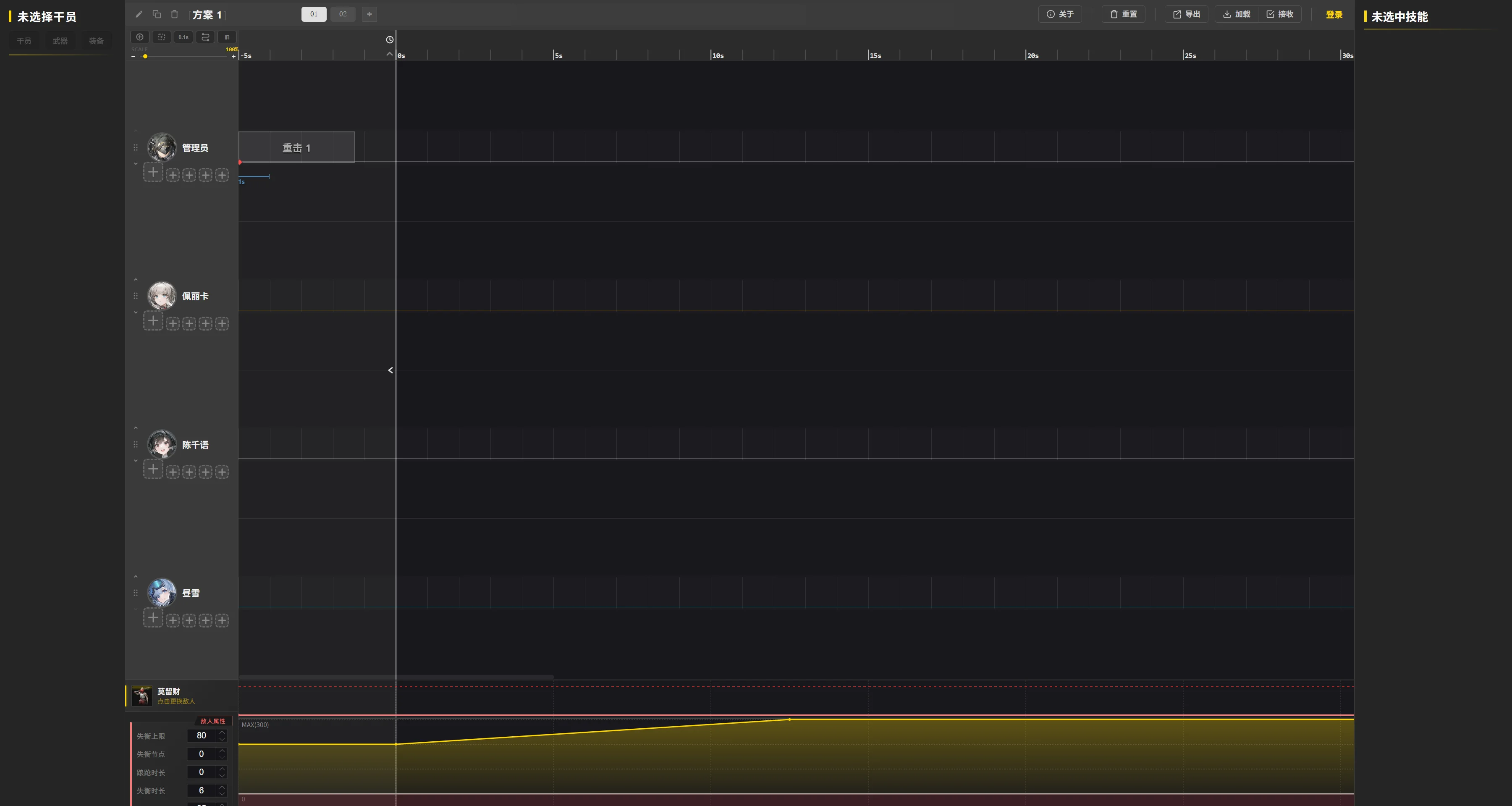 队伍属性配置:可设置 “初始技力(默认 200)”“技力回复 / 秒(默认 8)”“技力上限(MAX 300)”,匹配实际队伍的技力循环节奏。