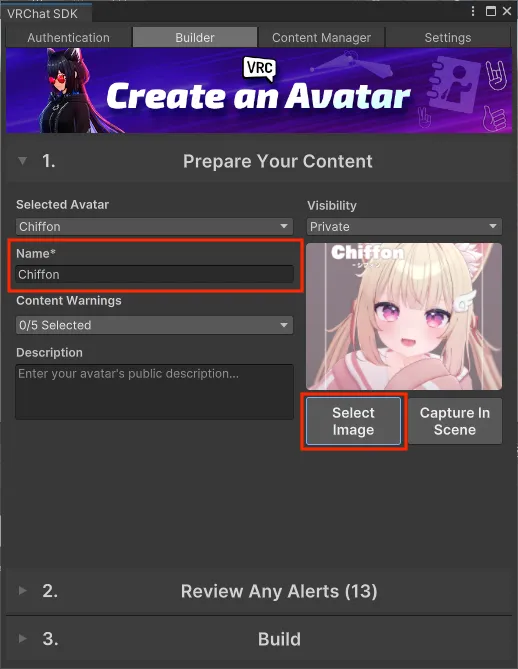 在Builder选项卡中的Prepare Your Content分区中,填写角色模型名称、上传角色模型图片并按照实际情况设置其他的元数据。