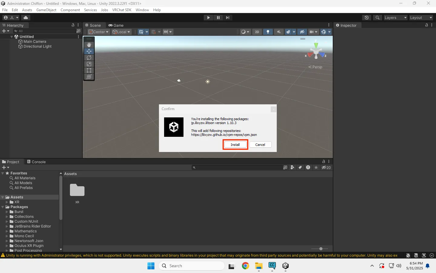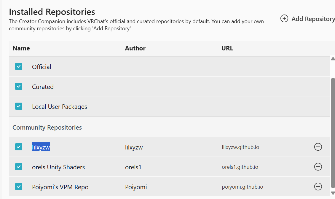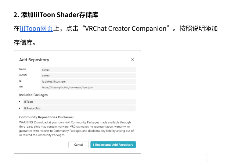 所以这里我们进入Liltoon官网 ,上文有链接。在官网页面中点击“VCC追加”,这会打开VCC并且将Liltoon的相关package源加入到VCC的列表中。如果以上步骤已经完成,那么VCC中将会显示。路径为VCC-Settings-Packages-Community Repositories-lilxyzw 这里显示的为Github仓库名。如果你的着色器没有一键导入的按钮,你也可以选择在该界面右上角“Add Repository”中手动添加Github仓库,或者导入用户包。