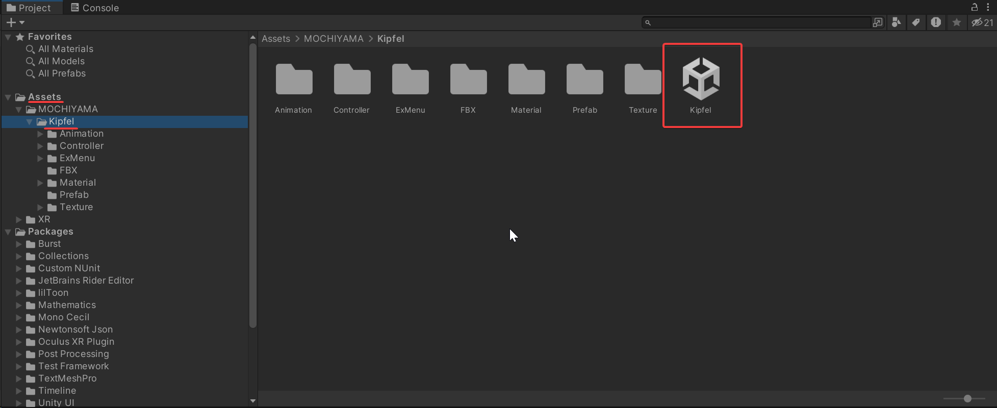 然后在文件管理中打开目录 Assets-模型名(Kipfel)-模型名(长者一个方块unity图标)