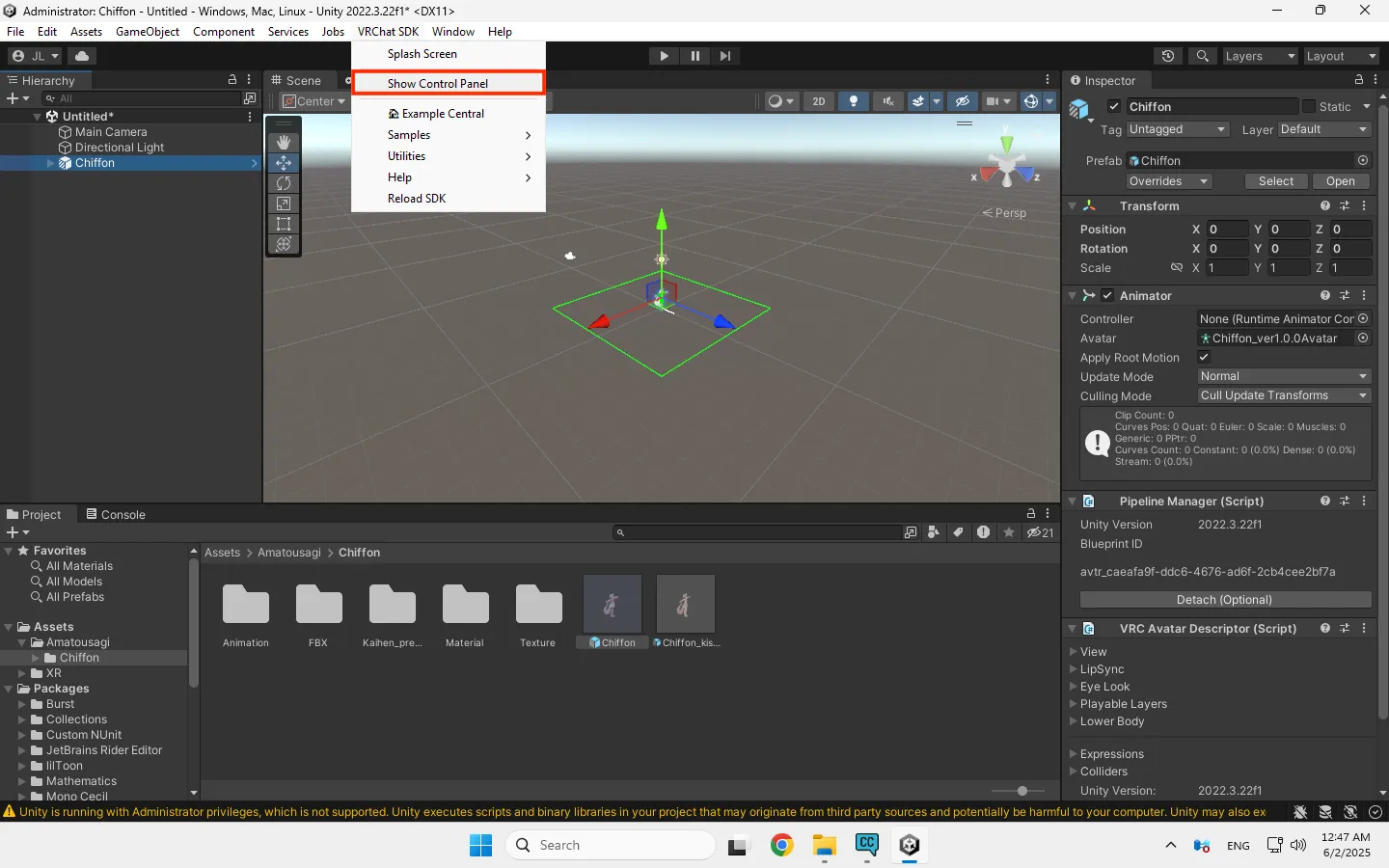在Unity上方菜单栏中找到VRChat SDK菜单,点击Show Control Panel打开控制面板