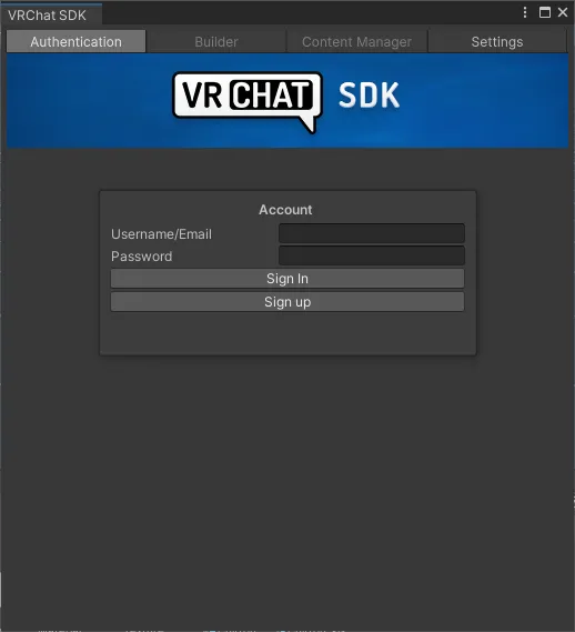 在上方浮标中选择“Authentication”,然后填入你的VRC官方账号账户以及密码。❕:需要注意的是如果此前你只是Steam登录,没有绑定VRC官网账户,你需要参考前文完成绑定工作,如果你的VRC账户等级没有达到限制条件也是无法完成上传工作的!